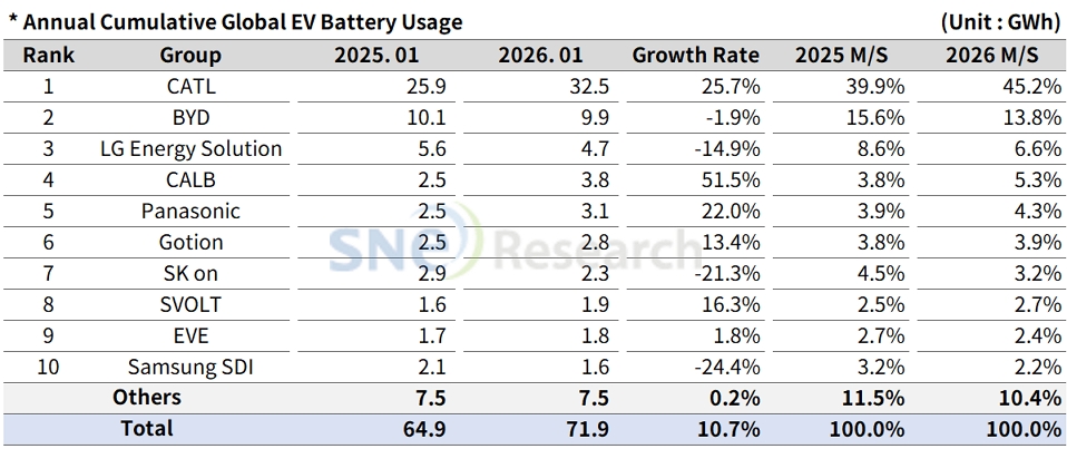 In Jan 2026, Global EV Battery Usage Posted 71.9GWh, a 10.7% YoY Growth