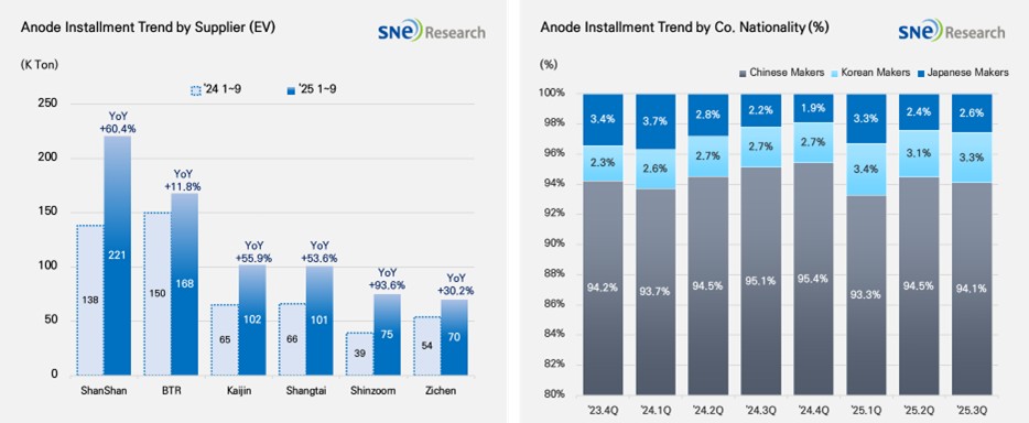 From Jan to Sep 2025, Global[1] Electric Vehicle Battery Anode Material Installment[2] Reached 958K ton, a 37.4% YoY growth