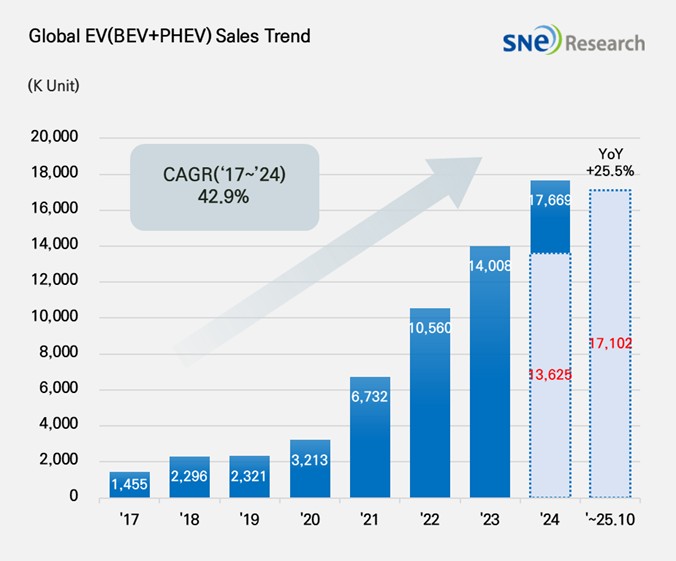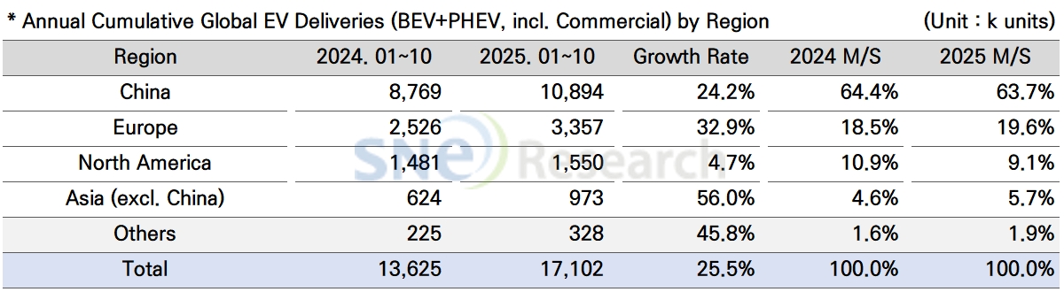 From Jan to Oct 2025, Global[1] Electric Vehicle Deliveries[2] Recorded Approximately 17.10 Mil Units, a 25.5% YoY Growth