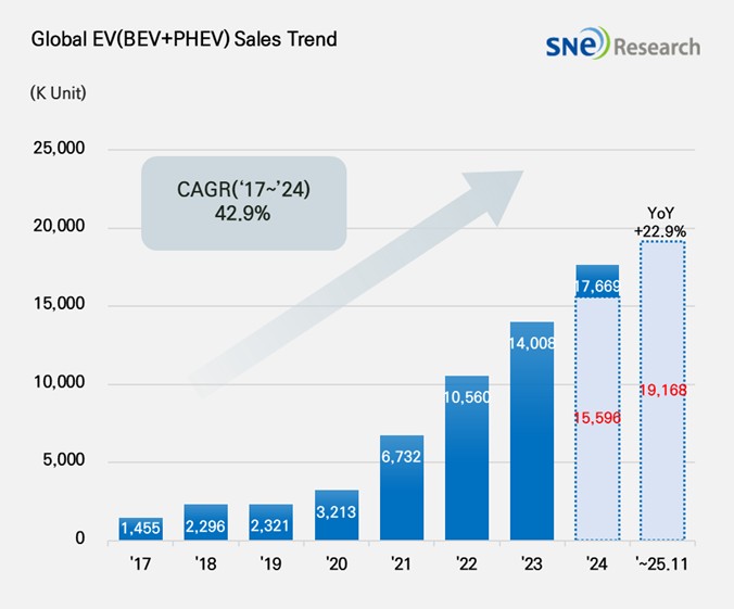 From Jan to Nov 2025, Global[1] Electric Vehicle Deliveries[2] Recorded Approximately 19.168 Mil Units, a 22.9% YoY Growth
