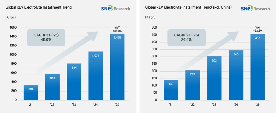 From Jan to Dec 2025, Global[1] Electric Vehicle Battery Electrolyte Installment[2] Reached 1,475K ton, a 37.3% YoY Growth