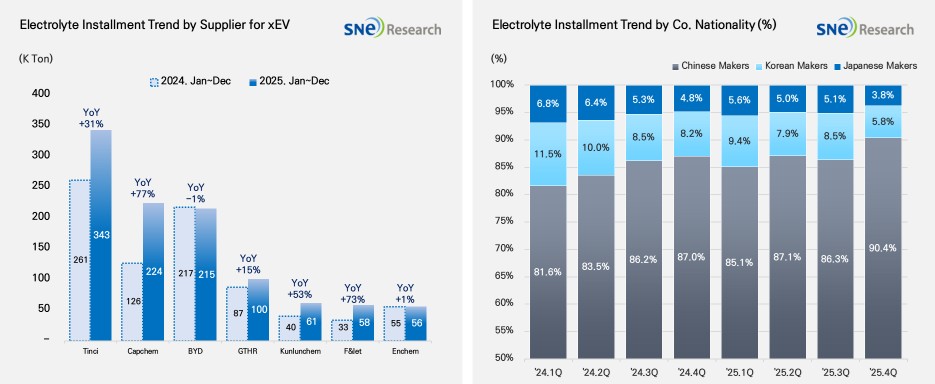 In terms of market share by nationality, Chinese companies continue to dominate the electrolyte market. As of the fourth quarter of 2025, the market share of Chinese firms reached 90.4%, while South Korean and Japanese companies recorded 5.8% and 3.8%, respectively. These figures represent a slight decrease compared to the same period last year. As the supply structure increasingly centers around Chinese suppliers, it is becoming more critical for non-Chinese companies to secure and enhance their competitiveness.