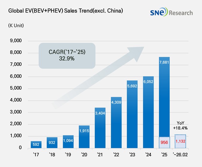 From Jan to Feb 2026, Non-China Global Electric Vehicle Deliveries Recorded 1.132 Mil Units, a 18.4% YoY Growth