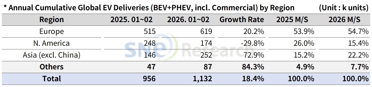 From Jan to Feb 2026, global electric vehicle (BEV+PHEV) deliveries excluding China totaled approximately 1.132 million units, representing a 18.4% year-on-year (YoY) increase. Despite a downturn in the North American market, the non-China global market maintained a relatively steady trend, supported by continued growth in Europe and Asia (excl. China). Notably, a distinct regional divergence emerged, with the stable expansion in Europe and high-speed growth in emerging Asian markets serving as the primary drivers of overall performance.