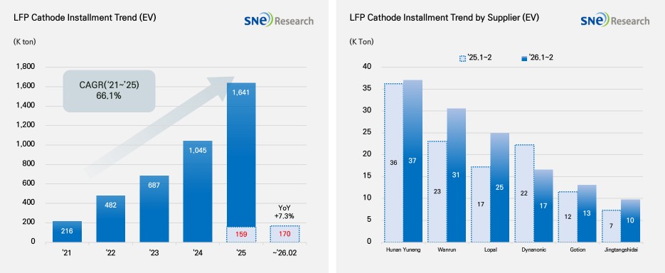 From Jan to Feb 2026, Global EV Battery Cathode Installment Reached 297K ton, a 5.1% YoY Growth
