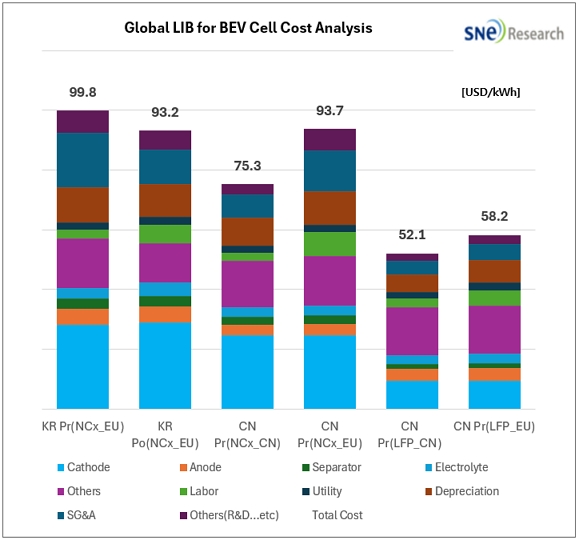 According to the recently published report, [2026] Lithium-ion Battery Cell Cost/Price Analysis & Outlook by SNE Research, Chinese prismatic LFP cells for BEVs were analyzed to be the most cost-competitive, with a selling price of approximately $52.1/kWh as of 2025.
