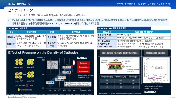 다음 단계인 고밀도화 공정에서는 전극과 고체전해질 간의 밀착도를 높이기 위해 프레스 기술이 활용된다. 대표적으로 등방압 공정(CIP, WIP, HIP)이나 롤프레스 기술이 적용되며, 이러한 공정은 계면 저항을 낮추고 이온전도 경로를 확보하는 데 핵심적인 역할을 한다. 특히 온간등방압(WIP) 기술은 비교적 낮은 온도에서 균일한 압력을 가해 전극 밀도를 향상시키는 기술로, 최근 주요 기업들이 적극적으로 도입하고 있다.