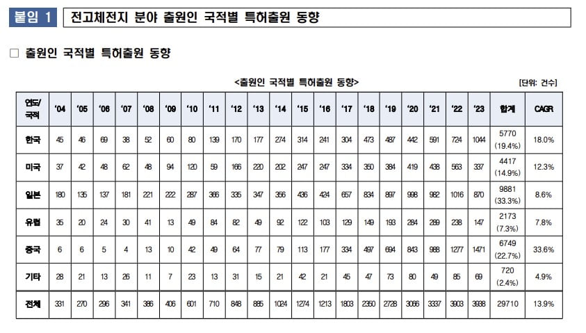 차세대 '전고체전지' 특허 경쟁, 한국 출원 증가율 세계 2위로 [한국경제]