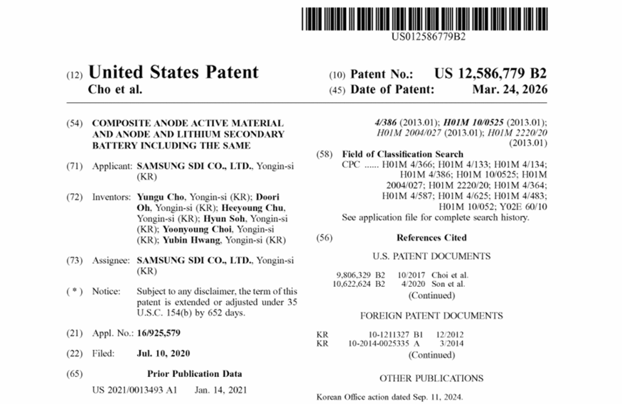 삼성SDI, 혼합 음극소재 미국 특허 획득…수명·에너지밀도↑ [더구루]