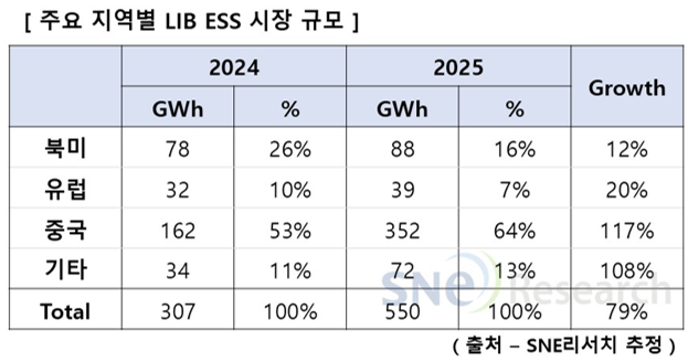 ‘25년 전세계 LIB ESS 배터리 시장규모 550 GWh 기록, 업체별 ESS LIB 출하량 M/S는 CATL 30%로 1위