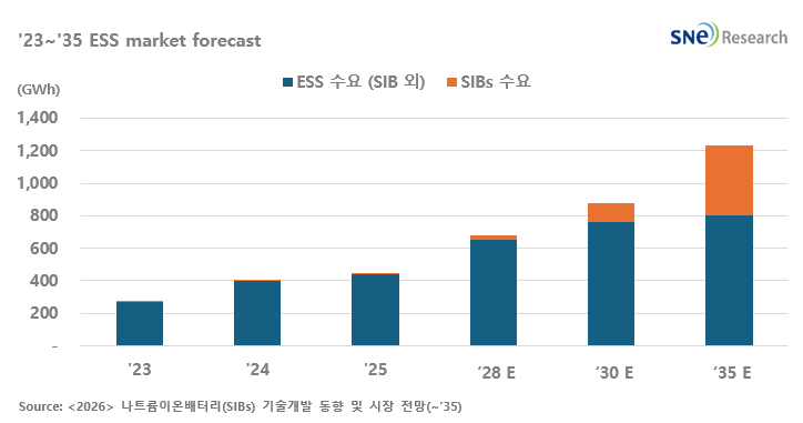 ‘<2026> 나트륨이온배터리(SIBs) 기술개발 동향 및 시장 전망(~’35)’에 따르면, 2025년 글로