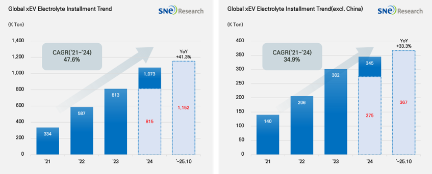2025년 1~10월 글로벌 전기차용 배터리 전해액 적재량 1,152K ton, 전년 동기 대비 41.3% 성장