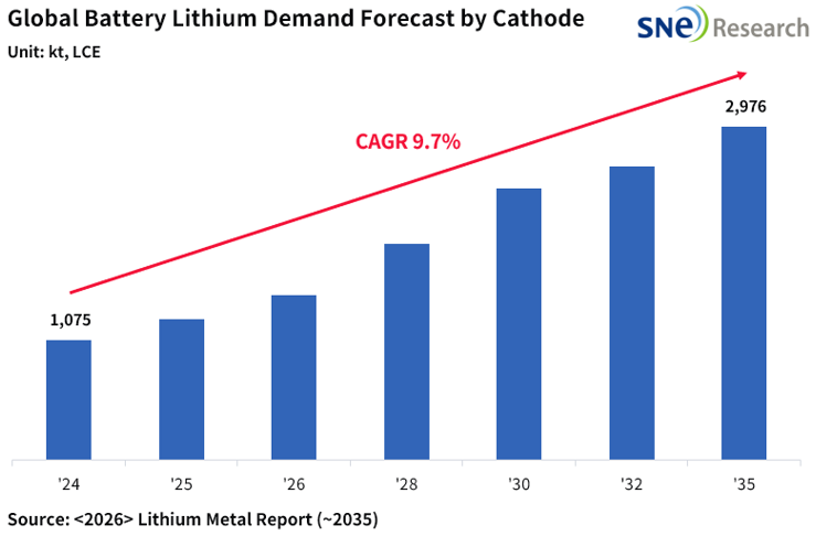 톤 필요할 것 글로벌 배터리용 리튬, 2035년 300만 톤 육박 전망 전기차 확산에 연평균 9.7% 성장…리튬 가격은 조정 이후 우상향 구간 진입 이차전지 시장조사 업체 SNE리서치의 리포트 「<2026> Lithium Metal Report (~2035)」에 따르면, 글로벌 배터리용 리튬 수요는 2035년 약 298만 톤(LCE, 탄산리튬환산)까지