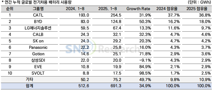 제목 : 2025년 1~8월 글로벌[1] 전기차용 배터리 사용량[2] 691.3GWh, 전년 동기 대비 34.9% 성장