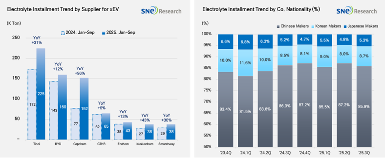 2025년 1~9월 글로벌 전해액 시장에서는 주요 공급업체들의 성장세가