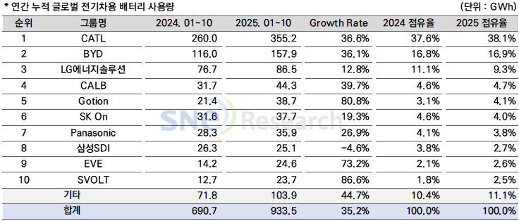 총 배터리 사용량은 약 933.5GWh로 전년 동기 대비 35.2% 성장했다.