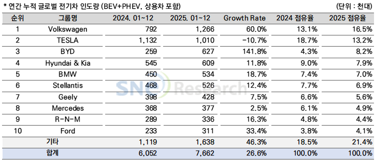 60.0% 증가한 126.6만 대를 판매하며 테슬라를 제치고 1위에 올랐다. 유럽 시장을 중심으로 ID.4, ID.7, ENYAQ 등 MEB 플랫폼 기반의 주력 모델들이