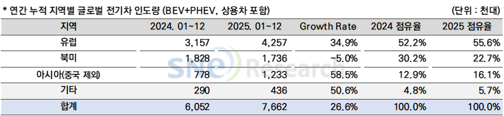 제목 : 2025년 1~12월 非중국 글로벌[1] 전기차 인도량[2] 약 766.2만대, 전년 대비 26.6% 성장