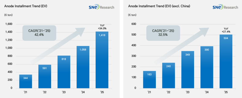 제목 : 2025년 1~12월 글로벌[1] 전기차용 배터리 음극재 적재량[2] 1,418K ton, 전년 동기 대비 34.0% 성장