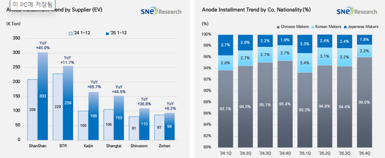 바탕으로 지배력이 더 공고해지고 있다. 한국 기업 비중은 2025년 1분기 3.4%에서 4분기 2.2%로 낮아졌고, 일본 기업 비중도 3.3%에서 1.8%로 하락하는 흐름이 확인된다. 전기차 시장 확장과 함께 실리콘 복합 음극재(Si-Anode) 채택이