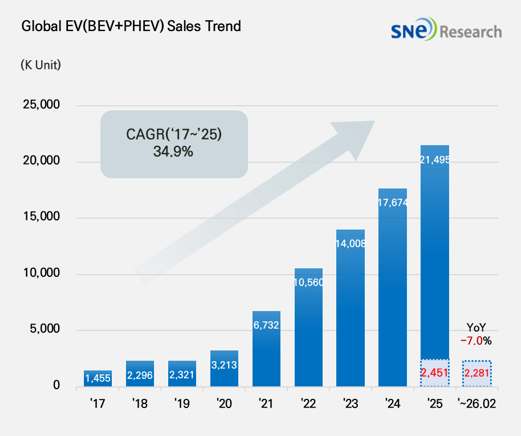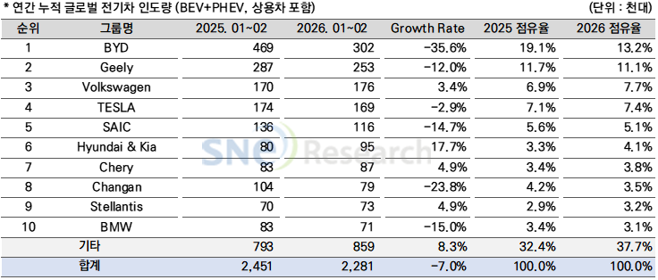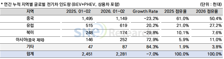 제목 : 2026년 1~2월 글로벌 전기차 인도량 228만 1천 대… 전년 대비 7.0% 감소