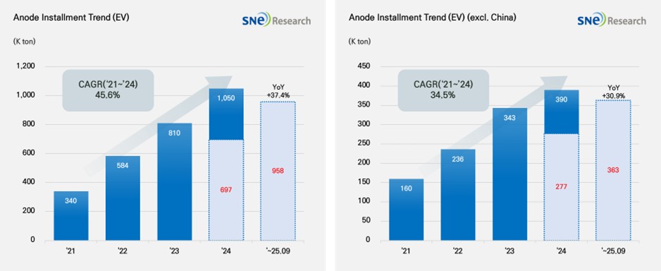 growth(Source: 2025 Oct Global EV & Battery Monthly Tracker (Incl. LiB 4 Major Materials), SNE Research)From Jan to Sep 2025, the total installment of anode materials in electric vehicles (EV, PHEV, HEV) registered worldwide was approx. 958K ton, posting a 37.4% YoY growth and staying in an upw