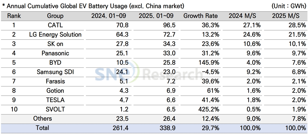 From Jan to Sep in 2025, Non-Chinese Global EV Battery Usage Posted 338.9GWh, a 29.7% YoY Growth