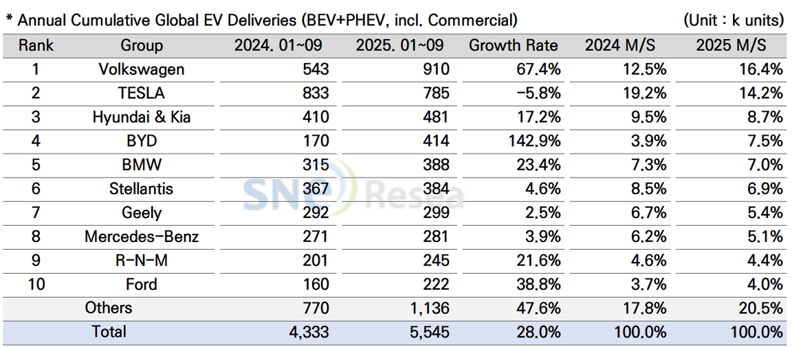 units, a 28.0% YoY increase. (Source: Global EV & Battery Monthly Tracker – Oct 2025, SNE Research) By group, Volkswagen Group took No.