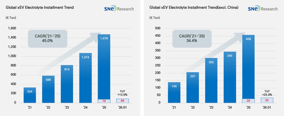 market showed a stable expansion in demand(Source: 2026 Feb Global EV & Battery Monthly Tracker (Incl. LiB 4 Major Materials), SNE Research) In Jan, the total installment of electrolyte used in electric vehicles (EV, PHEV, HEV) registered around the world was approx. 89K t