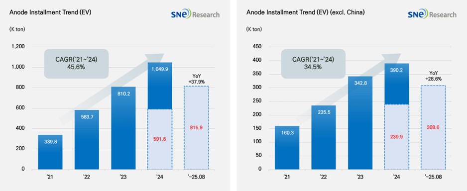 From Jan to Aug in 2025, Global[1] Electric Vehicle Battery Anode Material Installment[2] Reached 816K ton, a 37.9% YoY Growth