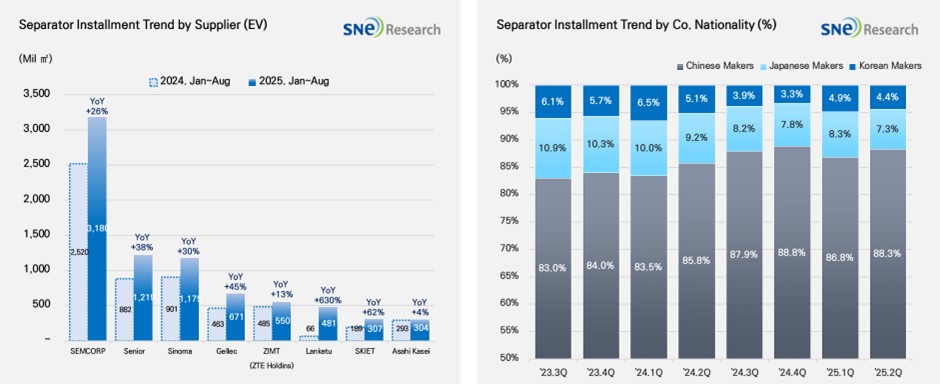 From Jan to Aug 2025, major separator suppliers showed noteworthy growth in the global separator market. In particular, the installment of SEMCORP’s separator was increased by 26.2% from the same period last year, reaching 3,180Mil ㎡ and leading the market. Other major Chinese companies such as Senior (+38.2%), Sinoma (+30.4%), and Gellec (+44.8%) also continued to be in an upward trend. Other than them, ZIMT and CMZF also posted more than double-digit growth, expanding their shares in the market. On the other hand, SK IE Technology from Korea also showed a 62.2% YoY growth, having 307Mil ㎡ of separator installed in EV batteries and exhibiting a steady growth.
