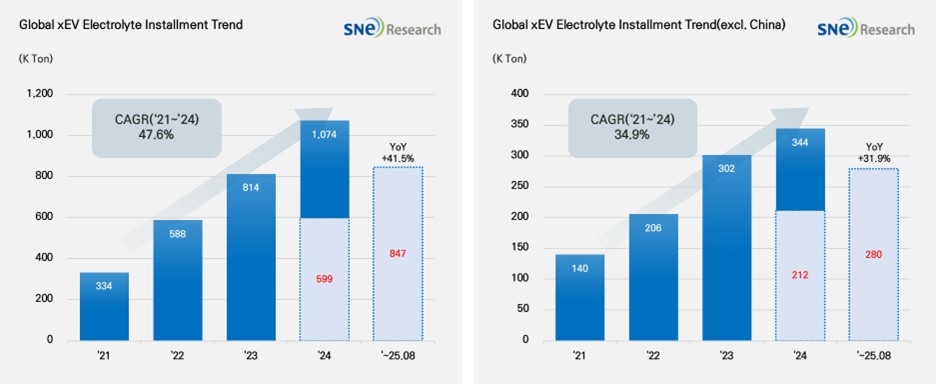 From Jan to Aug 2025, Global[1] Electronic Vehicle Battery Electrolyte Installment[2] Reached 847K ton, a 41.5% YoY Growth