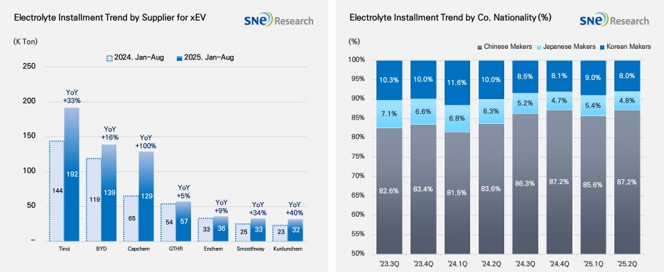 In terms of market shares of companies by nationality, the Chinese electrolyte suppliers are still leading the market. As of Q2 2025, the market shares taken by the Chinese electrolyte companies were 87.3%, while the Korean and Japanese companies took up 7.9% and 4.8%, respectively. The market shares held by the Korean and Japanese electrolyte makers were slightly lower than the same period of last year. While the Chinese companies are solidifying their market dominance, it becomes more important for the non-China companies to secure their own competitive edge.