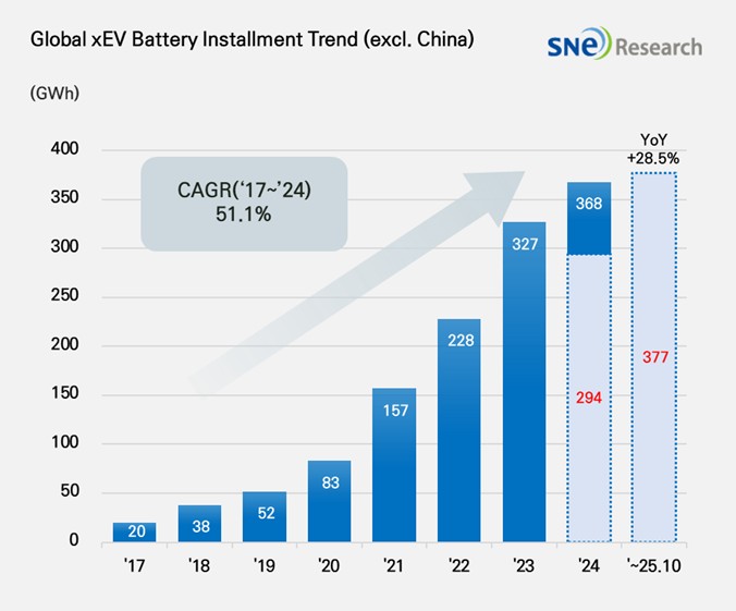 From Jan to Oct 2025, Non-Chinese Global[1] EV Battery Usage[2] Posted 377.5GWh, a 28.5% YoY Growth