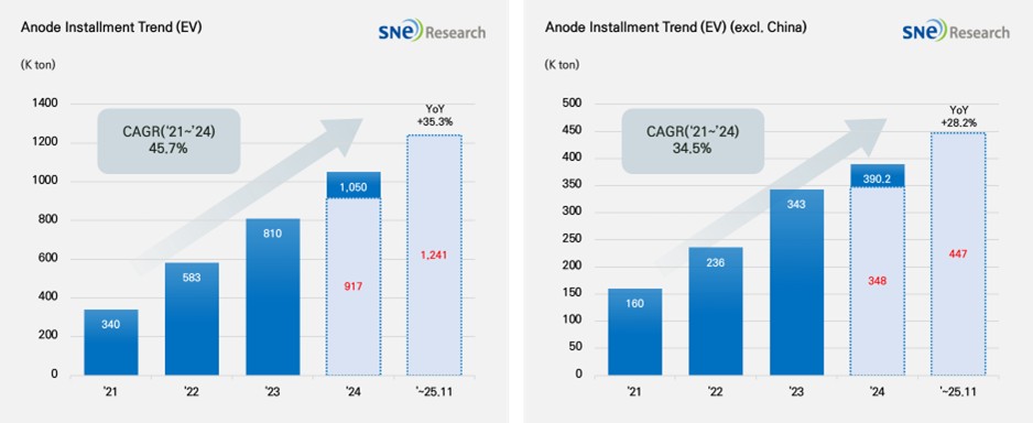 From Jan to Nov 2025, Global[1] Electric Vehicle Battery Anode Material Installment[2] Reached 1,241K ton, a 35.3% YoY Growth