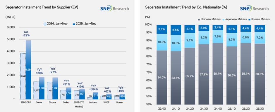From Jan to Nov 2025, major separator suppliers showed notable growth in the global separator market. In particular, the installment of SEMCORP’s separator was increased by 29% from the same period last year, reaching 4,956Mil ㎡ and leading the market. Other major Chinese companies such as Senior(+28%), Sinoma(+27%), and Gellec(+31%) also continued to show strong growth in the market. Other than them, ZIMT and Lanketu also recorded a double-digit growth, increasing their shares in the market. Meanwhile, SK IE Technology from Korea also showed a 62% YoY growth, having 467Mil ㎡ of separator installed in EV batteries and exhibiting a steady growth.