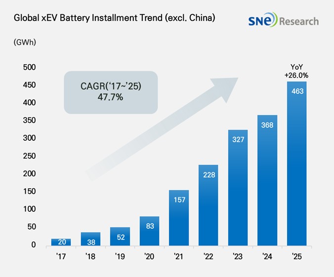From Jan to Nov 2025, Non-Chinese Global[1] EV Battery Usage[2] Posted 463GWh, a 26.0% YoY Growth