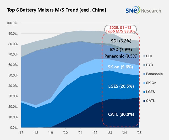 In 2025, the global electric vehicle (EV) battery market excluding China maintained its physical growth, expanding by 26.0% year-on-year. However, as the competitive landscape underwent a significant reshuffling, the combined market share of the three major South Korean battery manufacturers declined. Notably, Chinese battery makers, led by CATL and BYD, continued to increase their usage even in non-Chinese markets. The diversification of supply chains by global OEMs and intensifying price competition are analyzed as the key drivers behind these shifts in market share. As a result, Korean manufacturers are facing heightened earnings volatility tied to the sales performance of their major clients. For 2026, uncertainties in EV demand within North America and the expanding presence of Chinese competitors in Europe are expected to remain as burdens on both shipment volumes and profitability recovery. However, the ability to defend competitiveness in non-Chinese markets is likely to vary depending on the expansion of ESS (Energy Storage Systems) demand and successful product portfolio adjustments. Consequently, future performance trajectories will be determined by the specific customer mix and the effectiveness of business strategy realignments.