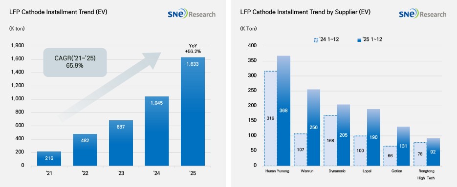 During the same period, the deployment of LFP (Lithium Iron Phosphate) cathode materials surged by 56.2% year-on-year, reaching 1,633K tons. LFP’s share of the total cathode material usage rose to approximately 62% (by weight), effectively driving the market. This rapid adoption is attributed to a combination of factors: the expansion of entry-level EVs in China, intensifying price competition, and the growth of budget-friendly models in Europe and emerging markets. By supplier, Hunan Yuneng (368K tons) maintained its top position, while Wanrun (256K tons) solidified its second-place ranking with significant growth. Dynanonic (205K tons) and Lopal (190K tons) also continued their upward trends. With Gotion (131K tons) and Rongtong High-Tech (92K tons) rounding out the list, the top tier remains exclusively composed of Chinese companies. Given the high concentration of the LFP supply chain in China, it appears unlikely that this supply structure will shift in the short term, even as efforts to expand local production in non-Chinese regions progress.