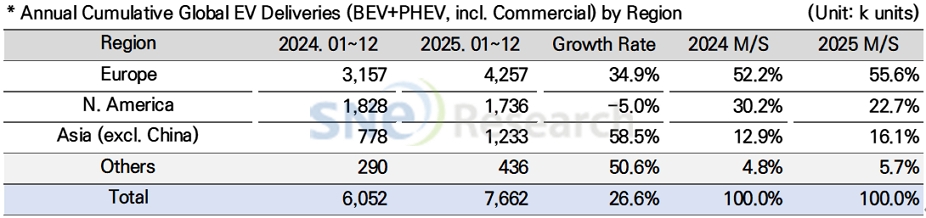 From Jan to Dec 2025, Non-China Global[1] Electric Vehicle Deliveries[2] Recorded About 7.662Mil Units, a 26.6% YoY Growth