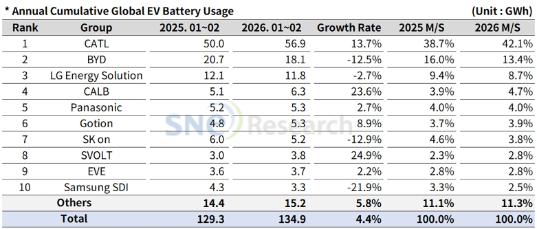 From Jan to Feb 2026, Global[1] EV Battery Usage[2] Posted 135GWh, a 4.4% YoY Growth