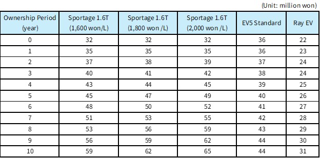 *Sportage 1.6T (gasoline) vs. EV5 Standard (NCM) (Unit: year, KRW/liter)