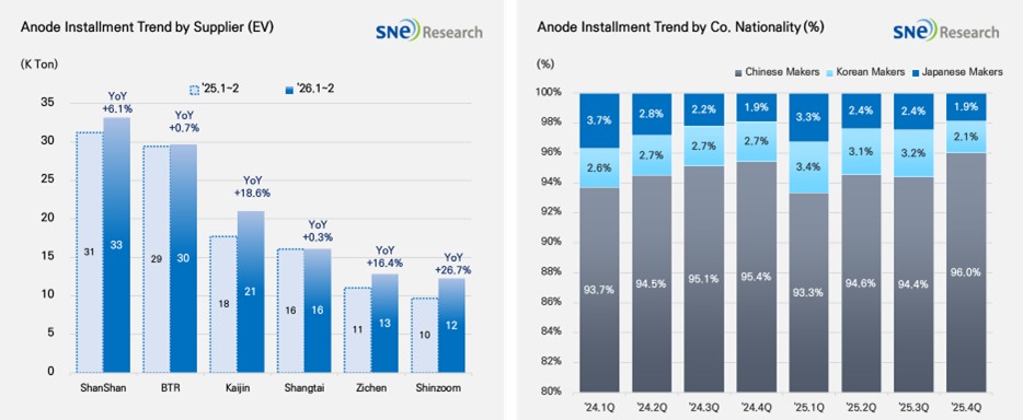 By corporate nationality, the share of Chinese companies rose from around 93% in Q1 2025 to 96% in Q4, further strengthening their absolute dominance. This is interpreted as a result of maintaining stable shipment volumes based on massive production capacity and price competitiveness, even during the cooling phase of global EV demand. This demonstrates that the global anode market remains heavily entrenched in a China-centric supply structure.
