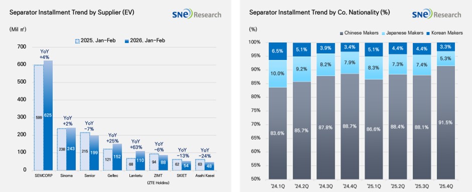 Last year, the global EV battery separator market maintained stable growth following the rise in battery installations; however, entering 2026, the growth rate has shown signs of a slight slowdown. In particular, as the pace of EV demand growth moderates, the increase in separator demand remains at a restricted level.