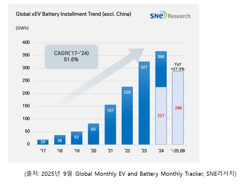 1~8월 非중국 전기차 배터리 사용량 전년比 27.3%↑…K-3사 점유율 38.3% [헤럴드경제]