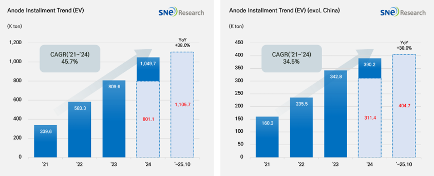 2025년 1~10월 글로벌 전기차용 배터리 음극재 적재량 1,106K ton, 전년 동기 대비 38.0% 성장
