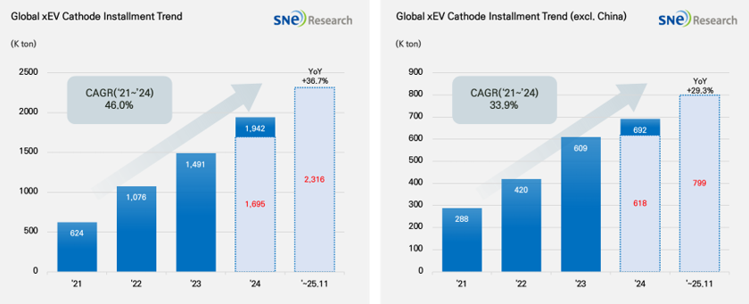 2025년 1~11월 글로벌 전기차용 배터리 양극재 적재량 2,316K ton, 전년 동기 대비 36.7% 성장