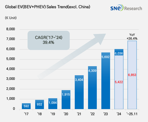 2025년 1~11월 非중국 글로벌 전기차 인도량 약 685.3만대, 전년 대비 26.4% 성장