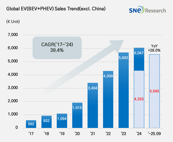 2025년 1~9월 非중국 글로벌 전기차 인도량 약 554.5만대, 전년 대비 28.0% 성장