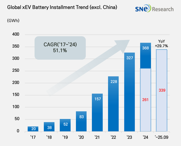2025년 1~9월 非중국 글로벌 전기차용 배터리 사용량 338.9GWh, 전년 동기 대비 29.7% 성장